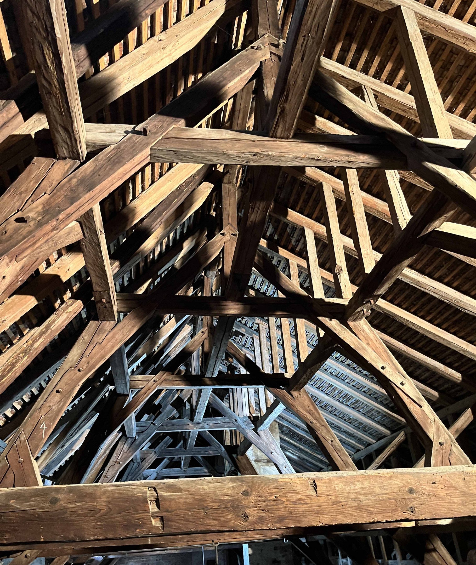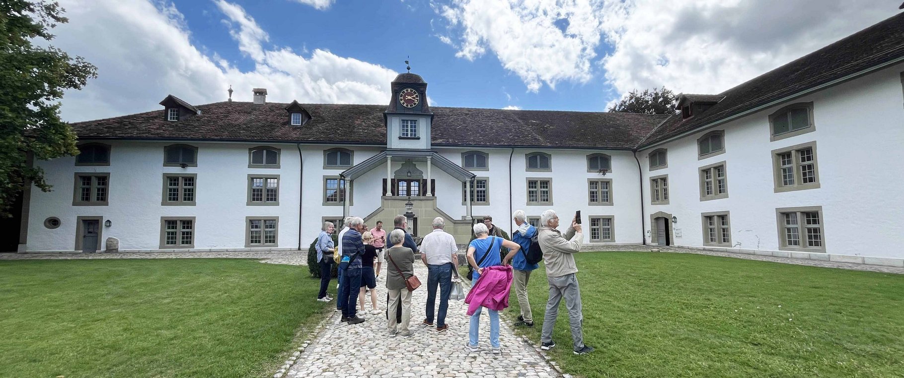 Die Führung durch die Aussenanlage und durch die Gebäulichkeiten standen unter der Leitung von Dr. Matthias Walter und Dr. Markus Thome von der kantonalen Denkmalpflege. Sie wiesen die 30 Teilnehmer auf Kostbarkeiten und bauliche Besonderheiten hin. Eine grosse Beachtung verdiente der Besuch des mächtigen Dachstuhls. Der Bauforschung sind die genaue Datierung der mächtigen Balkenkonstruktionen des Süd- und Westflügels sowie den genauen Ablauf der Umbau- und Ergänzungsarbeiten von 1535 zu verdanken.